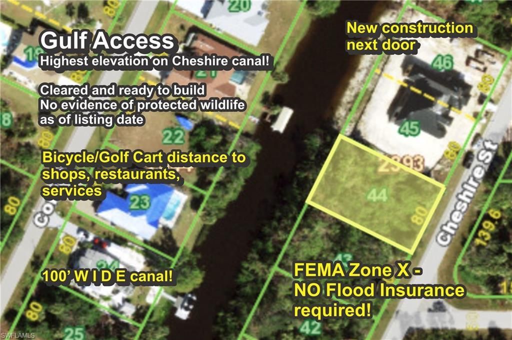 GULF ACCESS? YES! WIDE CANAL? YES! HIGH ELEVATION? YES! LOCAL OWNERS? YES!BOOMING AREA WITH NEW SHOPS AND SERVICES? YES! CLEARED AND READY FOR BUILDING? YES!*****HIGHEST ELEVATION ON CHESHIRE STREET! This lot is all about the YES! Would easily go for $150K+ in Cape Coral, with additional expense there for utility assessments, high taxes and stringent seawall requirements - but not here. This HOT new area is easier and more reasonable. Build that Gulf Access home you've been dreaming about within...GULF ACCESS? YES! WIDE CANAL? YES! HIGH ELEVATION? YES! LOCAL OWNERS? YES!BOOMING AREA WITH NEW SHOPS AND SERVICES? YES! CLEARED AND READY FOR BUILDING? YES!*****HIGHEST ELEVATION ON CHESHIRE STREET! This lot is all about the YES! Would easily go for $150K+ in Cape Coral, with additional expense there for utility assessments, high taxes and stringent seawall requirements - but not here. This HOT new area is easier and more reasonable. Build that Gulf Access home you've been dreaming about within easy bicycle distance of new shops, restaurants and services. A hidden gem with the features and new construction adjacent that set it apart.*****NOT in Scrubjay Permit Boundary, NO evidence of tortoise burrows as of listing date. ******** Spot elevation 10.6', FEMA Flood Zone X (Areas determined to be outside the 0.2% annual chance floodplain, NO FLOOD INSURANCE REQUIRED.) Look at the flood map of Cheshire Street, this is the highest point.*****